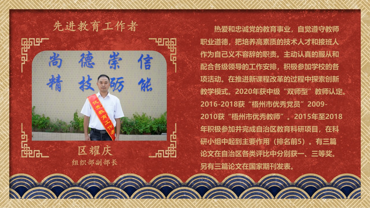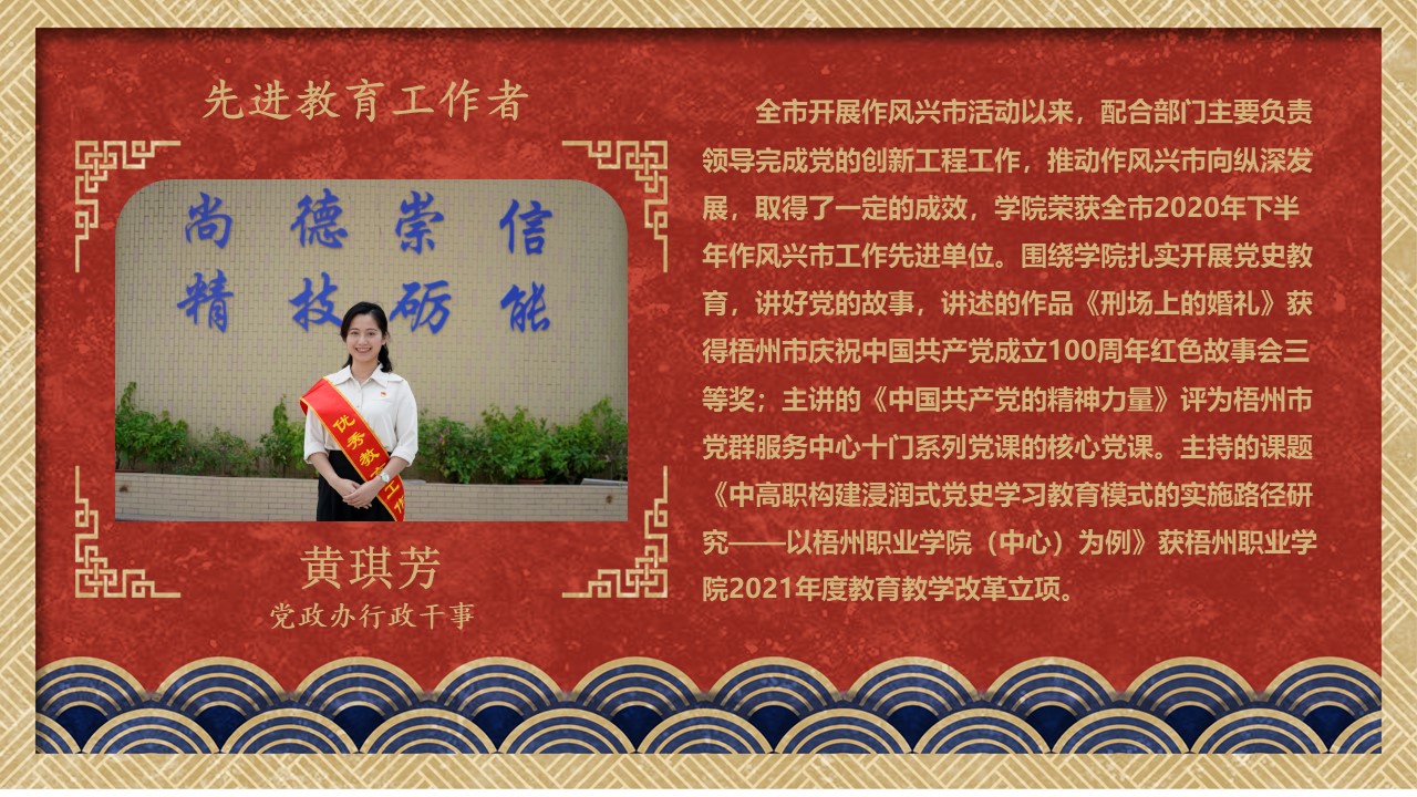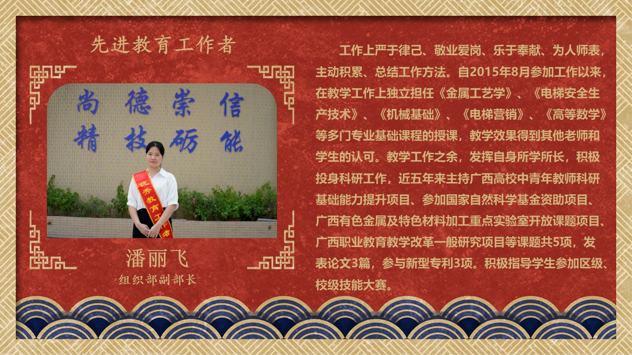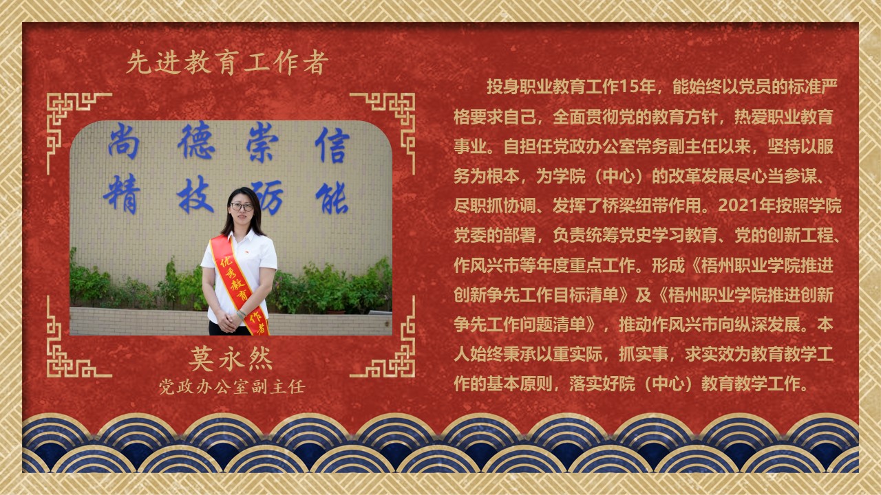 编者按:在今年教师节,机关党支部的莫永然、区庆耀、黄琪芳、潘丽飞同志荣获2021年学院先进教育工作者称号。现特将4名同志的事迹张榜公布,一方面是为了展现事迹,表扬先进,一方面是为了激励广大党员群众向先进看齐,在工作学习中争创先进,形成你追我赶、力争上游的可喜局面,为学院(中心)发展做出新的更大贡献。