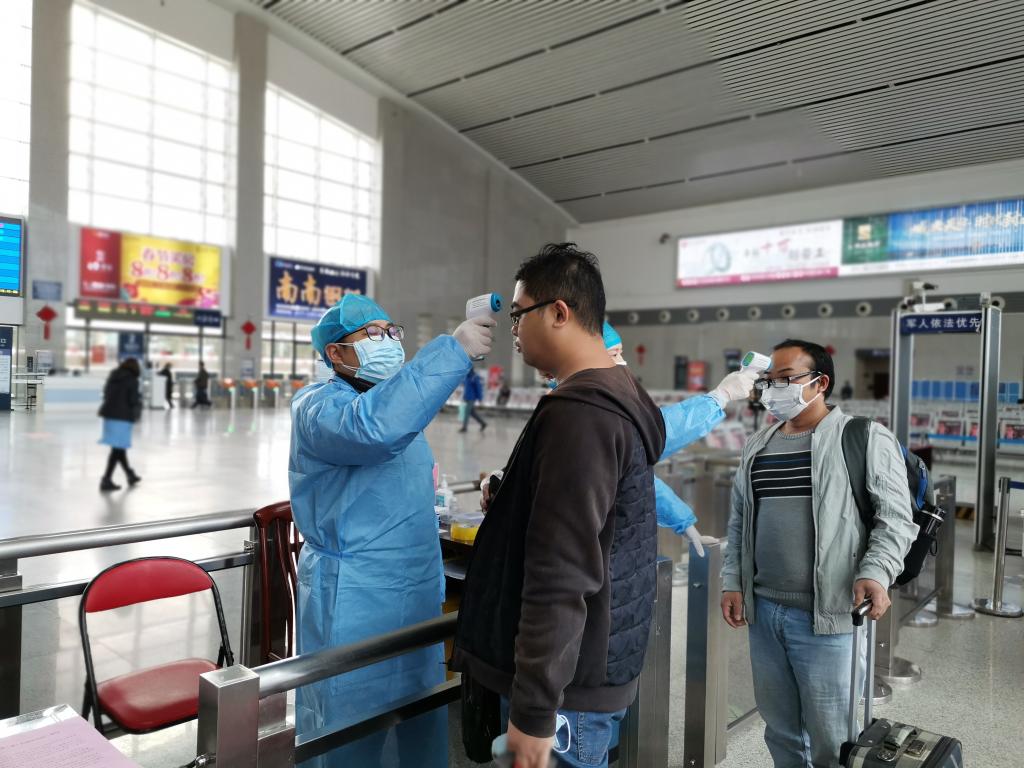 2月16日下午,梧州南站进站大厅门口。机关党支部党员、学院党委书记时伟身简易穿防护服,手持电子测温仪,和梧州市人民医院的工作人员一道,依次为乘客检测体温。