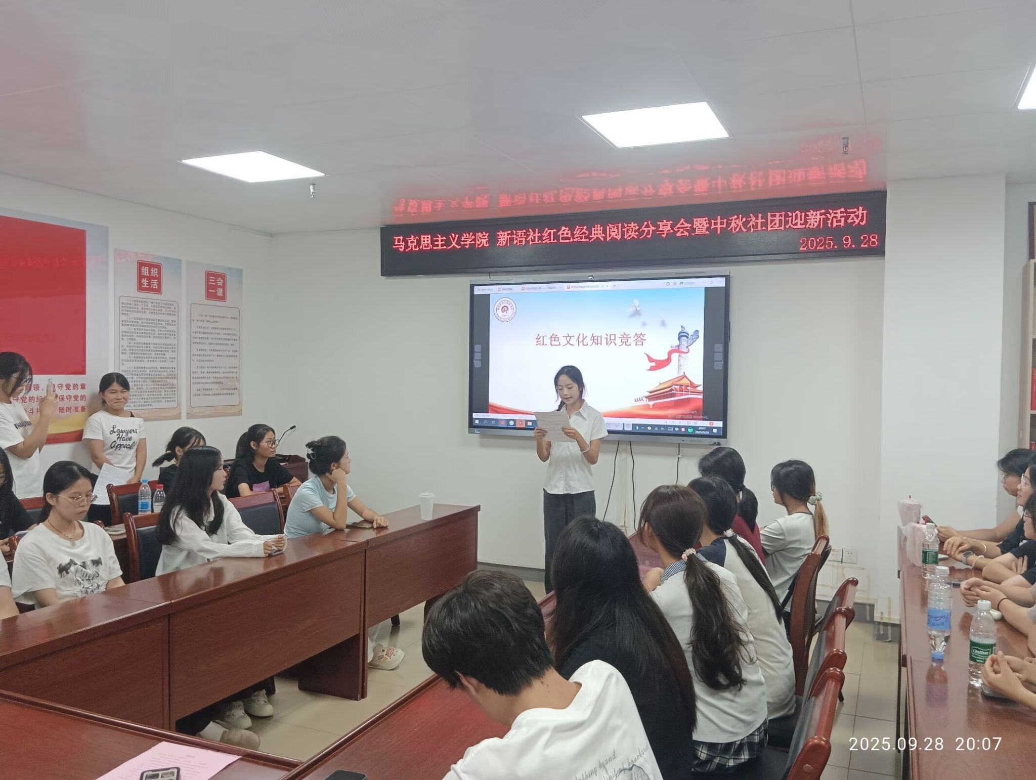 一轮明月照古今,一面红旗映初心。2025 年 9 月 28 日,马克思主义学院党支部党员教师携手新语社成员,举办了一场红色经典分享会暨中秋迎新活动。