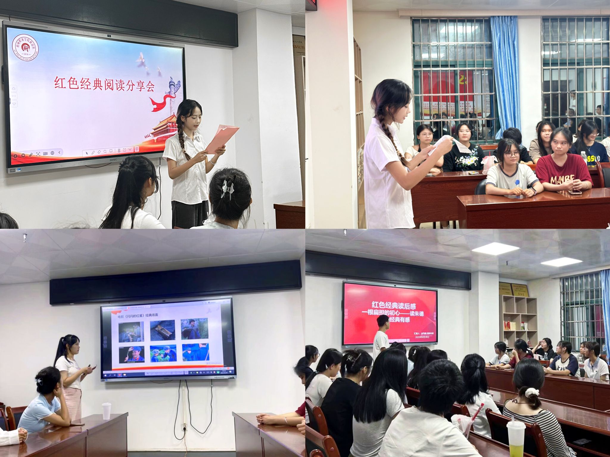 随后的红色经典阅读分享会中,新语社成员文秀、王欣昱、祝北勇分别围绕《红星照耀中国》《闪闪的红星》《一根扁担的初心》分享学习体会,引领在场师生回顾革命峥嵘岁月,深刻感悟信仰力量。
