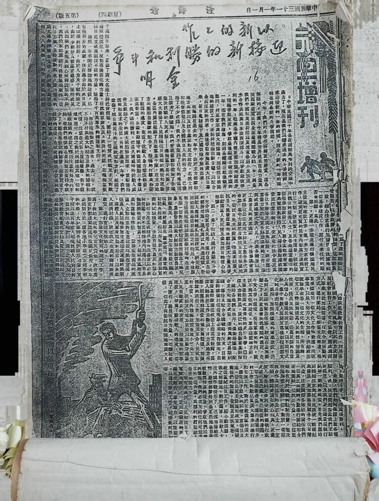 冬尽春来,中国人民在浴血抗战中迎来了1942年。这一年,被称为“抗战最艰难的一年”,无论是正面战场还是敌后战场,都面临着极为艰苦的考验。“以新的工作迎接新的胜利和斗争”,中共淮海区党委机关报《淮海报》在1942年1月1日出版的元旦增刊中,刊发了淮海区党委书记金明的题字和整版长文,呼吁全体军民以新的战斗姿态迎接新的一年。