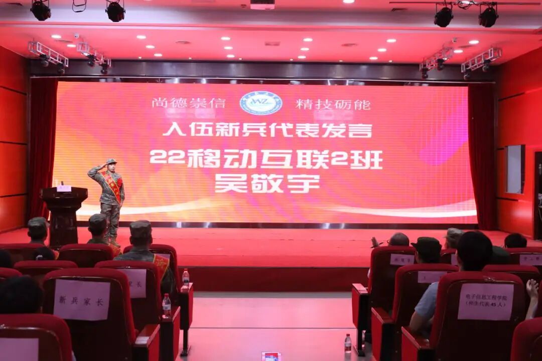 入伍新兵代表发言,从校园学子到入伍新兵的心路历程。他们表示,将带着在学校所学的专业知识和 “尚德崇信,精技砺能” 的校训精神奔赴军营,以实际行动报效祖国。
