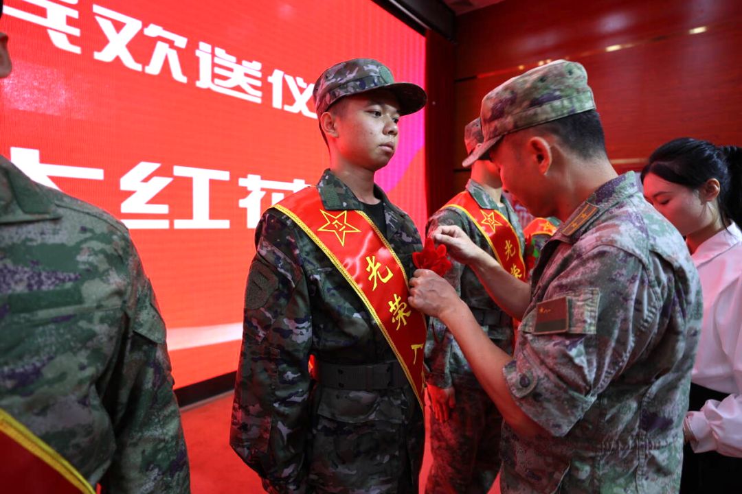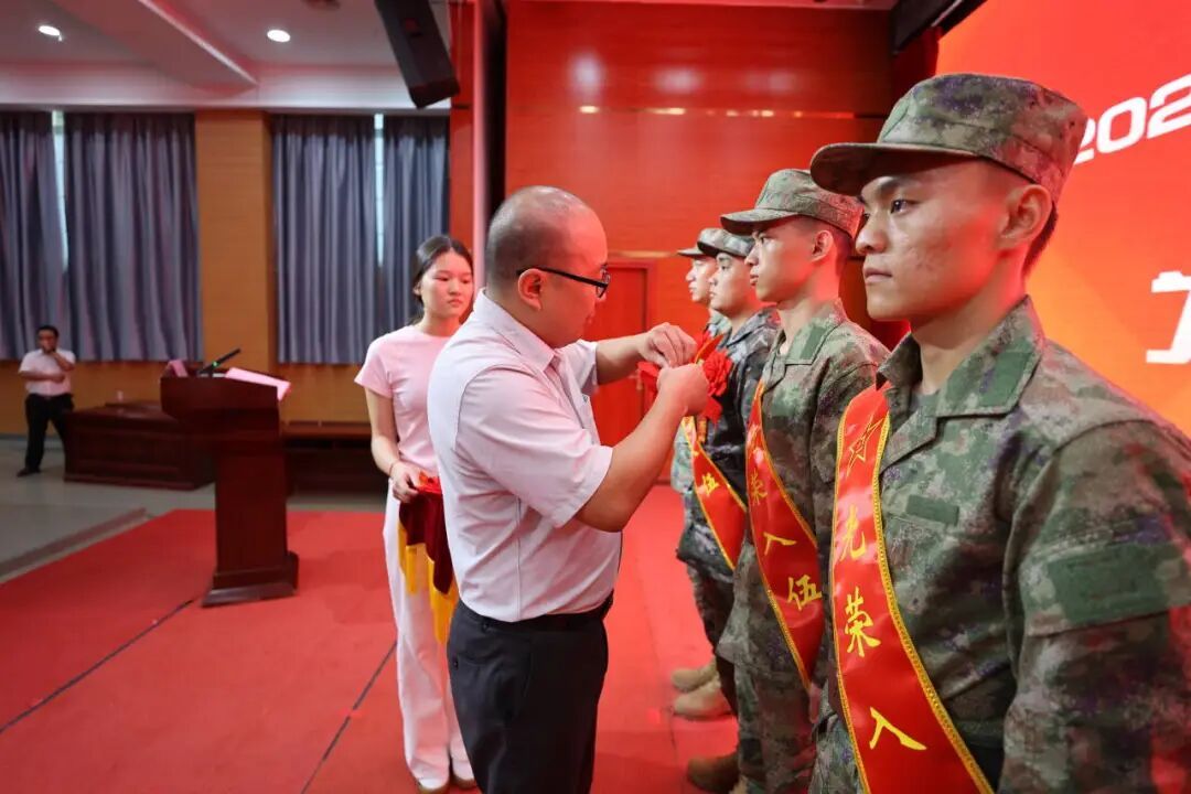 欢送仪式在庄严的国歌声中拉开序幕。长洲区人民武装部副部长杨森华宣读beat365应届毕业生应征入伍新兵名单。他们响应祖国号召,在毕业之际主动报名参军,以 “毕业即从戎” 的实际行动诠释青年担当。随后,与会领导为毕业生新兵逐一佩戴大红花。