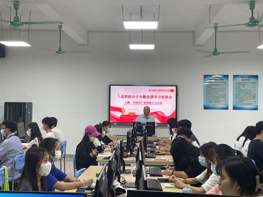 5月12日,电子信息工程学院党总支开展入党积极分子专题党课学习宣讲会。党总支书记曾祥海同志以“中国共产党的建立与宗旨”为主题进行授课,总支部新发展的教师和学生入党积极分子参加学习。
