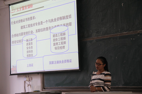 本次剖析的专业均为各系的重点专业,包括机电一体化技术、汽车检测与维修技术、建筑工程技术、酒店管理、宝玉石鉴定与加工技术、会计与审计等,剖析主讲人均为该专业的骨干教师。活动期间,剖析主讲人借助多媒体手段,边演示PPT文档边做解说,态度严肃认真。