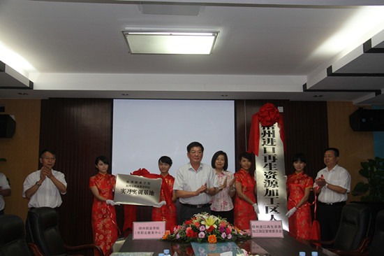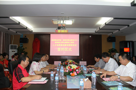 在签字仪式上,园区工委书记梁钦和梧州市委副秘书长、学院党委书记张凌贞先后致辞,双方表达了合作的意愿,阐明合作的目的和意义,随后学院院长、职教中心主任李丹虹与园区管委会主任曾键勇签署协议并交换协议文本,最后双方领导共同为基地揭牌。