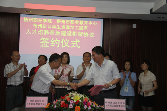 6月15日上午,学院(职教中心)与梧州进出口再生资源加工园区签订了人才培养基地建设框架协议。协议签订仪式在梧州进出口再生资源加工园区会议室举行。梧州市委副秘书长、学院党委书记张凌贞,学院院长、职教中心主任李丹虹、学院副院长、职教中心副主任梁小坚、学院和职教中心党政办主任胡江枫与梧州进出口再生资源加工园区管委会主任曾健勇、工委书记梁钦、纪工委书记陆献忠等一同出席了签字仪式。