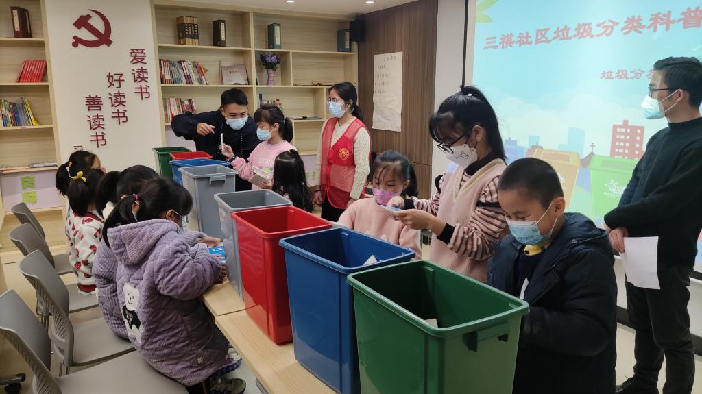 开展垃圾分类宣传。在三祺社区,党员教师志愿者为社区小朋友开展垃圾分类知识讲座。活动中,志愿者通过知识讲解、游戏互动等环节,向孩子们普及垃圾分类常识,有效提高了小朋友们的垃圾分类意识,并引导小朋友积极参与到实践垃圾分类的行动中来,不断提高自觉保护环境卫生的意识,养成垃圾分类的好习惯。