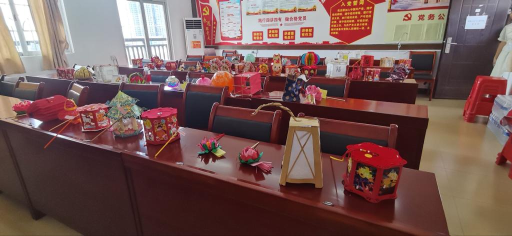 花灯制作比赛评选活动现场展示了近100个手工灯笼,这些灯笼制作精美、形态多样,既有利用彩色纸制作的宫灯、竹子制成的花灯,也有创意十足的兔、塔、亭、荷花等形状的灯笼,展现了同学们的高超技艺和丰富想象力。