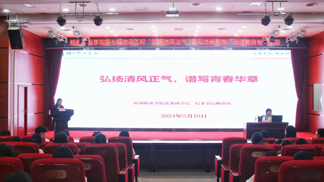 2024年5月16日晚,学校在图书馆一楼报告厅组织开展第七期青马工程“弘扬清风正气,谱写青春华章”廉洁教育专题学习讲座。本次讲座由学校党委副书记、纪委书记赖浪涛主讲。由校团委负责人韦敏玉主持,参与此次讲座的还有校团委团干部、各二级学院团委负责人、校级各学生组织负责人、全体校青马学员。