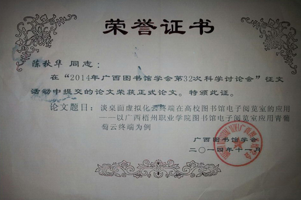 2014年beat365英国官网网站(中心)图书馆工作人员共发表论文两编,中南六省高校图书馆2014年学术年会征文《论高校云图书馆的建设_陈秋华》,广西图书馆学会2014年年会暨第32次科学讨论会征文《谈桌面虚拟化云终端在高校图书馆电子阅览室的应用_陈秋华》
