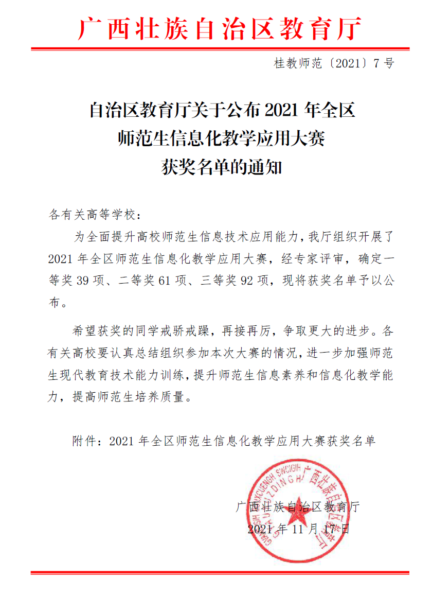 近日,自治区教育厅主办、广西教育技术学学会和南宁师范大学联合举办的全区师范生信息化教学应用大赛公布获奖通知,我校参赛人数44人,参赛项目12项,获奖人数18人,获奖项目4项,其中1项二等奖、3项三等奖,相比去年,获奖等级和数量都有了较大的提升。