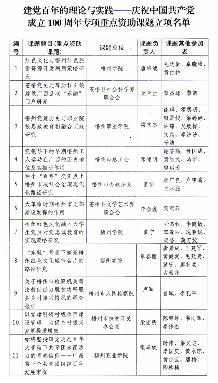 beat365英国官网网站教学科研处积极组织教师申报《建党百年的理论与实践——庆祝中国共产党成立100周年专项课题》,经过专家集中评审、梧州市社科联党组讨论通过,梧州学院等单位申报的11个课题予以立项,beat365梁文志、银翠娇两位老师成功获得重点资助课题立项项目,这是beat365首次在梧州市社科联获得党建专项课题。未来,学院将着力推动党建课题研究,促进学校党建研究工作水平再上新台阶。