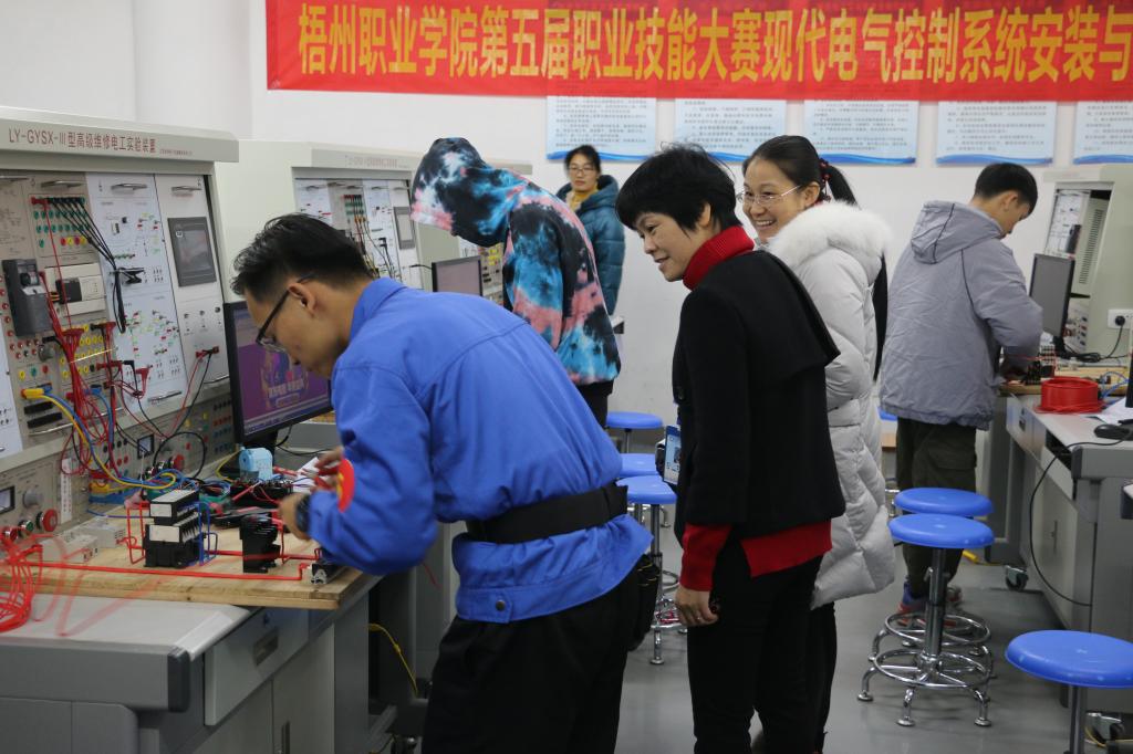 学院院长陈森英、党委副书记赖浪涛、学院副院长姚冰先后在教学科研处同志的陪同下,对“餐厅服务”、“电梯层轿门安装项目比赛”、“健康与社会照护”、“网店运营”、“学前教育专业教育技能”等项目进行巡视,了解赛况。