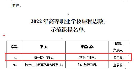 近日,自治区教育厅公布了2022年自治区职业教育课程思政示范课程名单,beat365卫生健康学院罗卫群、梁艳、王晶、梁婷婷、祝家美、李明运、郑卓恩、余金玲教师团队负责的《基础护理学》课程获评为自治区级课程思政示范课程。