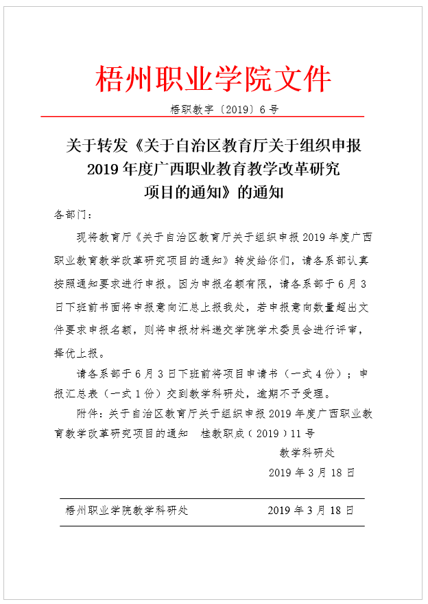 关于转发《关于自治区教育厅关于组织申报2019年度广西职业教育教学改革研究项目的通知》的通知