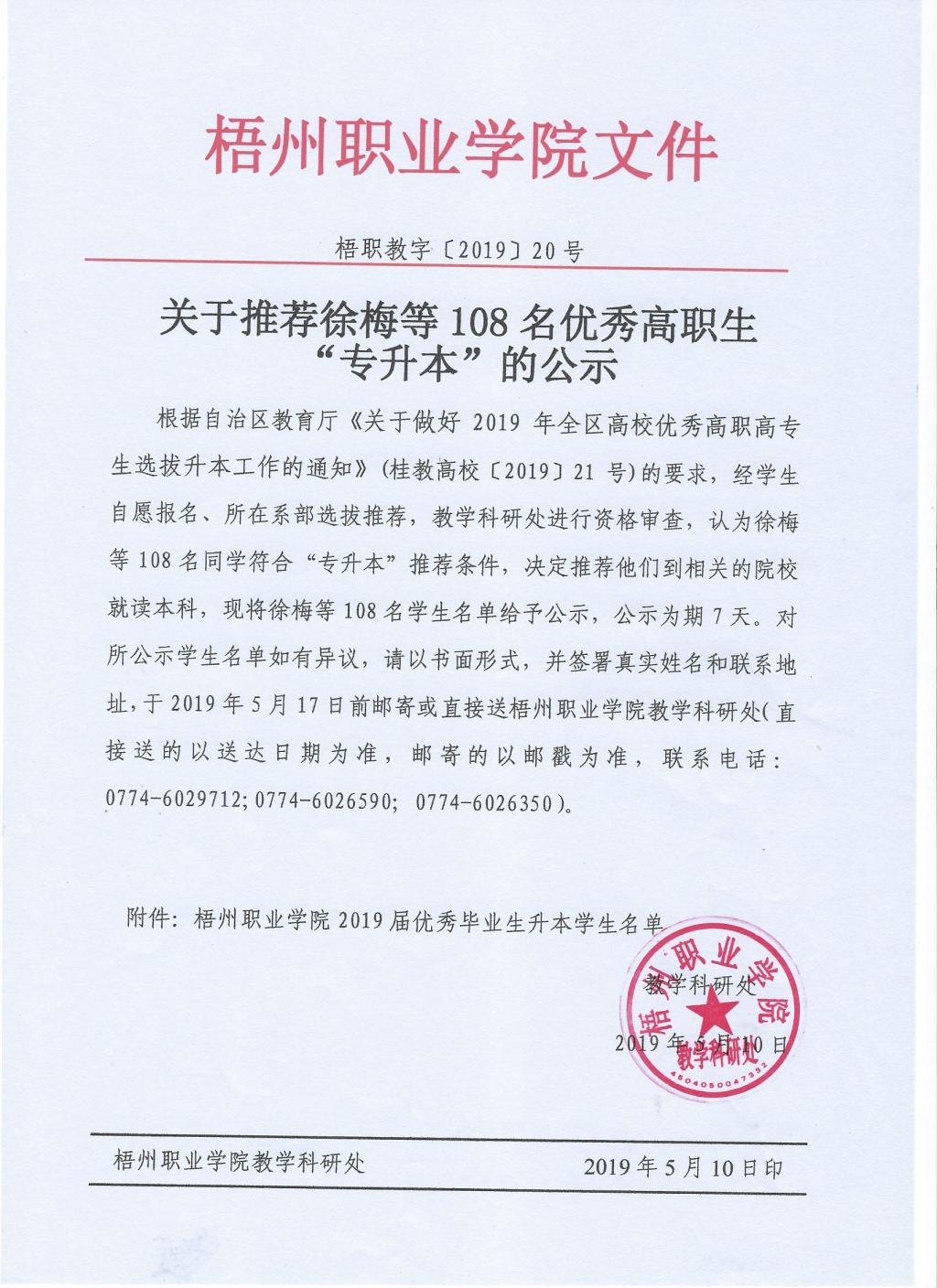 关于推荐徐梅等名优秀高职毕业生就读本科的公示