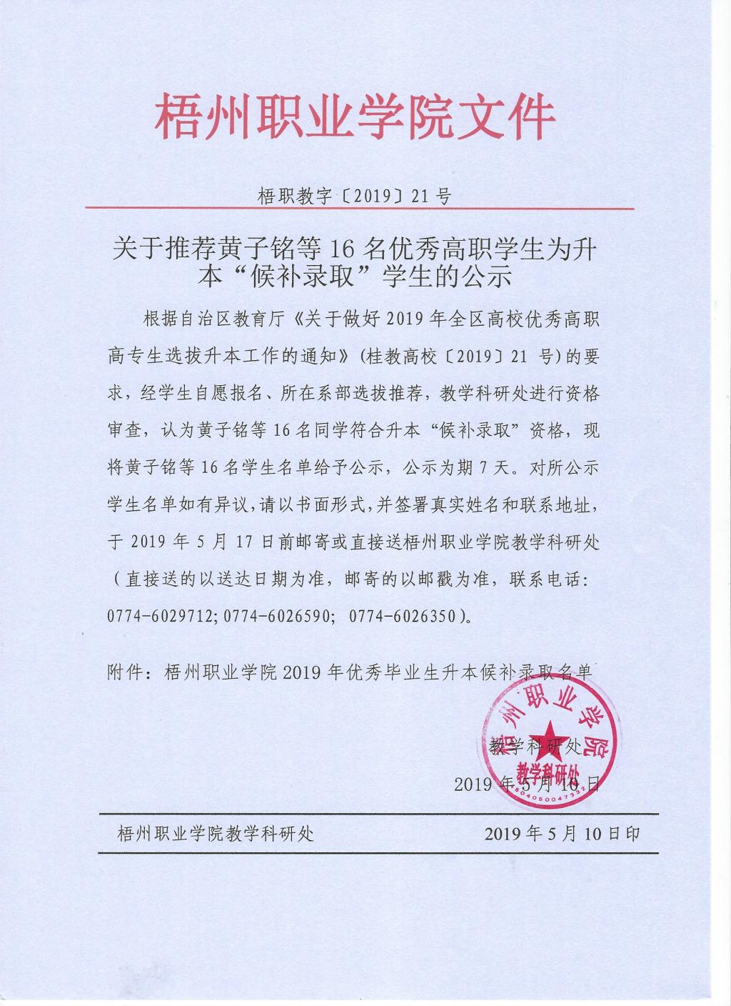关于推荐黄子铭等16名优秀高职学生为升本“候补录取”学生的公示