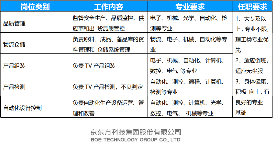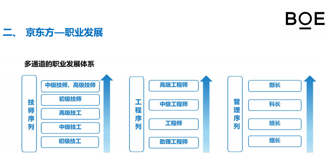 2、 管理序列:管理方向发展,可晋升为组长、班长、科长、部长等,目前京东方处于建设期,管理岗晋升机会多;