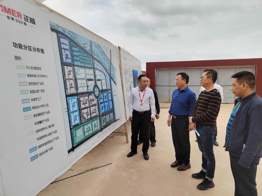 陈森英一行在梧州(正威)国际宝玉石文化创意产业园项目负责人陪同下,走访了一期A区项目部,深入了解正威集团在技术研发、人才培养、企业管理方面的先进经验,以及产业园内企业旭平首饰公司在人造首饰、人造宝石、工艺品加工及销售人才、用工方面的实际需求和困难。