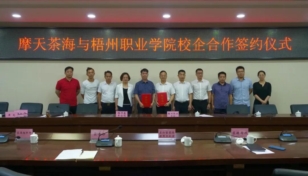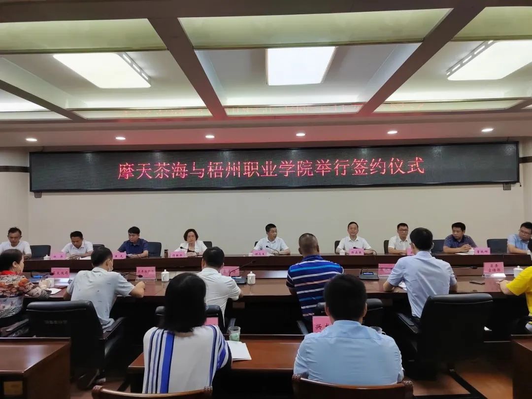 长洲区委副书记谢远生、beat365英国官网网站校长陈森英、beat365英国官网网站副校长梁恩、摩天茶海董事长黄光、公司负责人关明锋等出席签约仪式并讲话。长洲区副区长陈敏红主持签约仪式。