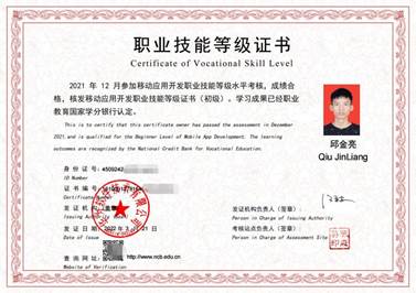 本专业考取华为《移动应用开发》职业技能等级证书,该证书是基于教育部 1+X证书试点制度,面向高职和应用型本科学生设置的职业技能认证考试科目,其目的是科学、公平、有效地测试考生掌握华为1+X移动应用开发课程中的理论知识和实操技能,尤其是基于Android和华为HMS开放能力进行移动应用程序实操开发的能力,评价的标准是考生能达到及格或及格以上水平。