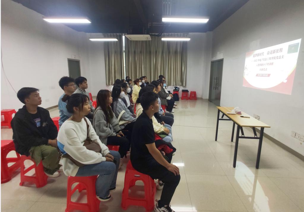 为深入学习宣传贯彻党的二十大精神和习近平新时代中国特色社会主义思想,使入党积极分子熟悉和掌握党的基本知识、基本理论,从而提高思想觉悟和党性修养,电子信息工程学院党总支于2022年11月25日,在第一教学楼304会议室采用线上、线下结合的方式召开了入党积极分子培训班开班仪式,共52名入党积极分子参加,电子信息工程学院党总支书记曾祥海出席开班仪式。