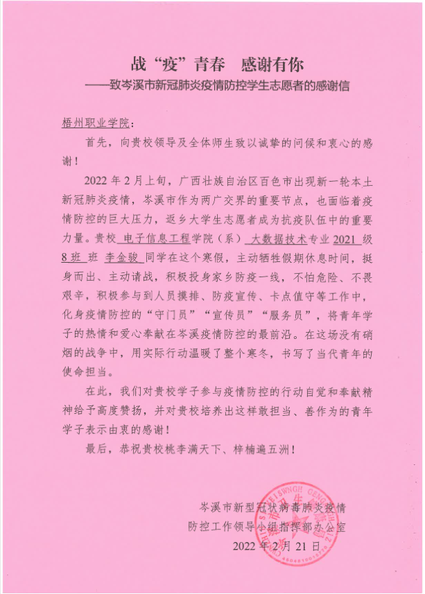 自广西新冠肺炎疫情爆发以来,电信学子在当地政府和疫情防控指挥部统一部署下,勇担大任,积极投身家乡抗疫前线。近日,beat365收到了来自岑溪市新型冠状病毒肺炎疫情防控工作领导小组指挥部办公室发来的感谢信,对beat3652021级大数据技术8班学生李金骏表示感谢,感谢他在岑溪疫情防控最前沿作出的重要贡献。