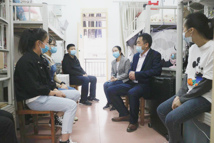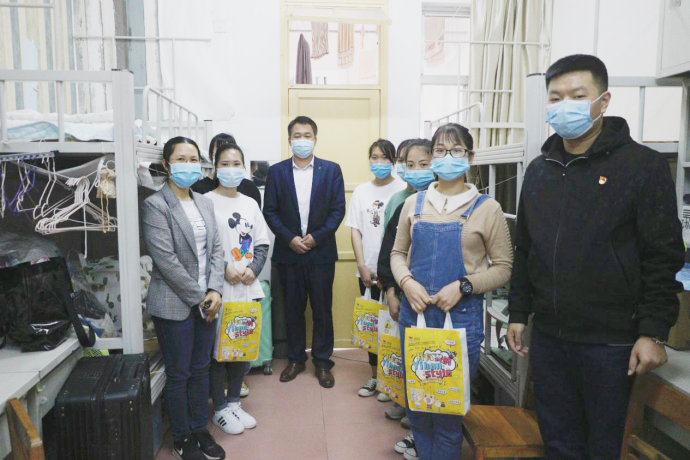 4月25日下午,beat365英国官网网站副院长李伟在卫职部书记林智东的陪同下, 深入返校学生宿舍,看望并慰问18级学生,系部专职辅导员曾政豪、学工处资助办何宏潜一同陪同走访慰问。