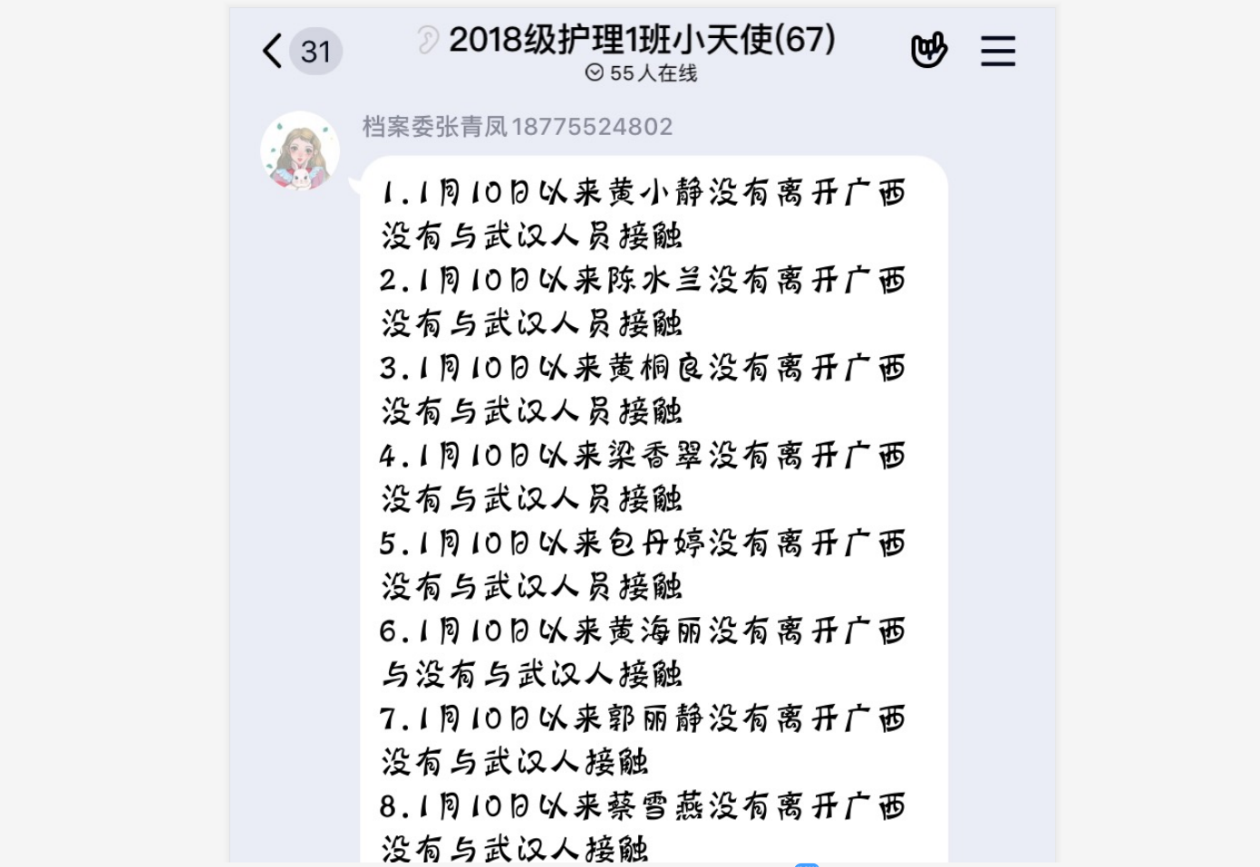 在排查阶段,为保证管辖学生能无一遗漏地接收消息,辅导员多管齐下,想方设法通过多种媒体手段和同学们保持密切联系。每当遇到qq、微信无法联系的情况,或有同学当日无回复无音讯,辅导员们总要拿起手机,通过电话查找、联系或询问,做到一个都不能少。