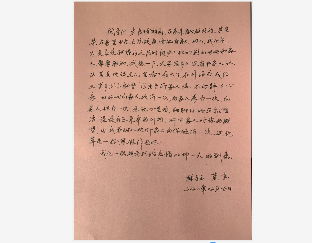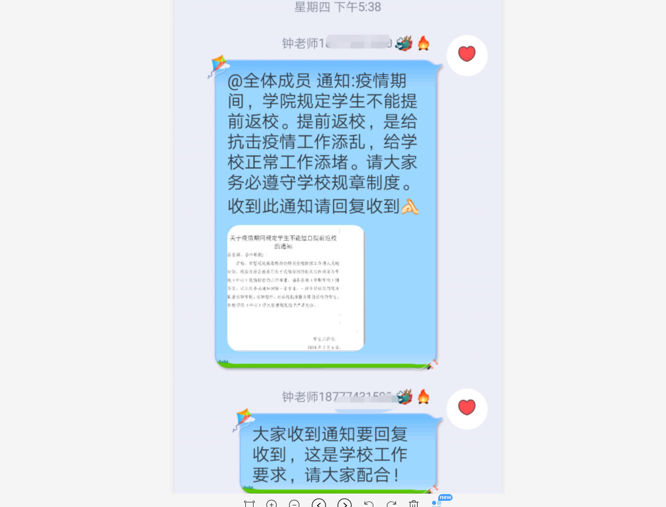 聚会、旅游、陪娃、回老家......辅导员们原本都有各自的度假计划,但是在疫情面前,一切计划都自觉为疫情防控工作让路。辅导员们深深明白,学生们的生命安全和身体健康大于天!大家于是自觉改变计划,二话不说提前上岗。辅导员们迅速查找联系自己管理的学生,每日汇总学生信息、排查学生假期去向,了解学生的身体情况;他们关心身体异常学生、组织学生回复签到、点对点联系实习生;他们每日关注疫情变化、传达学院工作布置、宣传疫情防控知识.....。