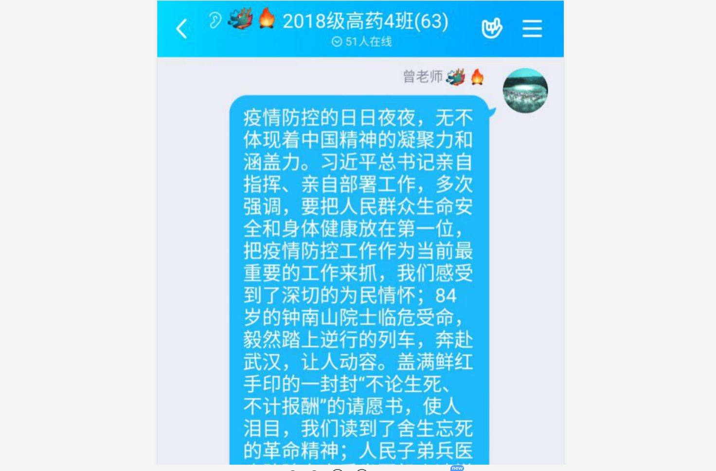 辅导员霍永妍老师在班级Q群分享优秀毕业生抗疫事迹