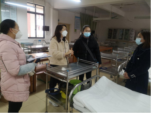 为了加强卫生健康学院各实训室的安全和卫生管理工作,规范实训管理,强化安全防范风险。12月20日下午,卫生健康学院副院长何晓彬带领各教研组负责人、实训基地负责人、实训管理员开展实训室安全卫生检查工作。 本次检查内容包括:实训室卫生环境、安全保障、实训设施、消防设施、化学药品管理等,着重检查了护理实训室、药学实训室、基础医学实训室的设施设备使用情况、化学试剂室的化学药品管理情况和各实训室的卫生安全落实情况。