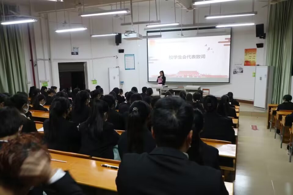 会议第三项议程,校学生会代表 蒙开纯 上台致辞