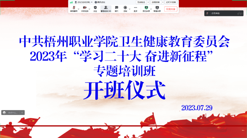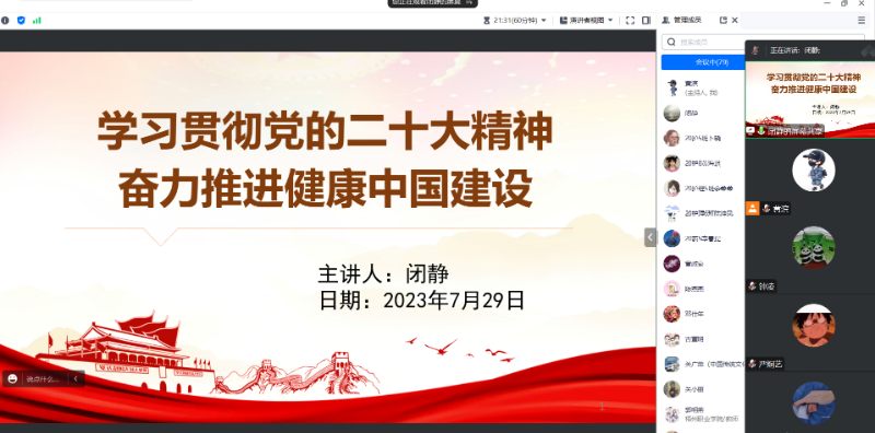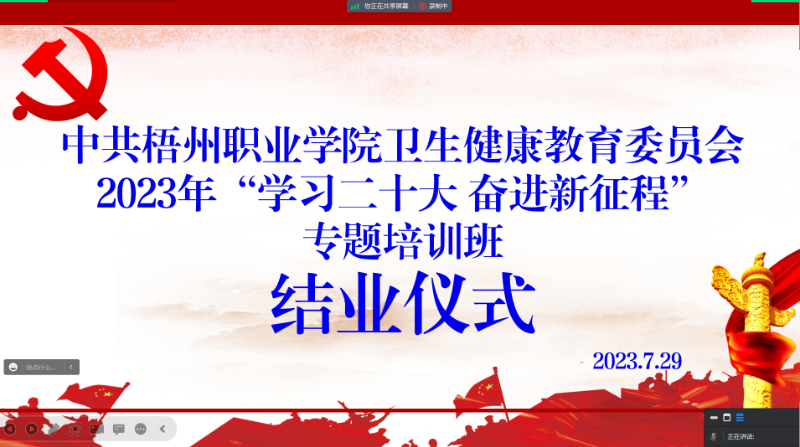 7月29日,中共beat365英国官网网站卫生健康教育委员会组织开展2023年“学习二十大 奋进新征程”专题培训班,参加人员有卫生健康学院(卫生教学部)全体党员共计89人。