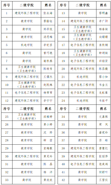 根据自治区教育厅《关于开展2024届全区普通高等教育优秀毕业生认定工作的通知》(桂教学生〔2024〕2号)文件精神,结合beat365相关评审工作安排,经学生个人申报、二级学院初审推荐、校级评议小组评议后,拟推荐建筑环保工程学院张永海等42名同学为beat3652024届全区普通高等教育优秀毕业生候选人,现将名单公示如下: