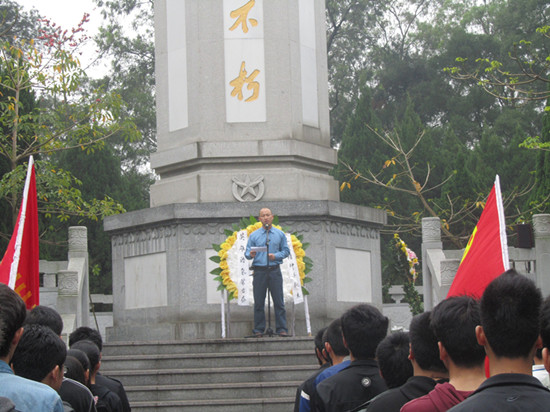 “少年志,则中国志,少年强,则中国强”,在烈士墓前,学工处李少成处长发表了讲话。在讲话中,他告诫广大的大学生一定要继承和发扬老一辈革命家的优良传统、不屈不挠的民族气节和精神,坚定信念,珍惜生命,诚实为人,踏实做事,为实现中华民族的伟大复兴肩负起我们这一代人的责任。学工处副处长、团委副书记刘宗虎希望大学生青年要在缅怀先辈的情怀中认知传统、尊重传统、继承传统,从中要受到教育,增进爱党、爱国、爱社会主义情感,珍惜今天的幸福生活,树立报效祖国的远大志向,为实现中华民族伟大复兴的“中国梦”而奋斗。