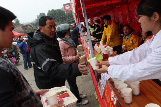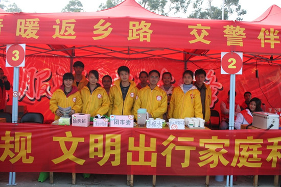 1月16,学工处党支部的教师党员和学生干部、团员共47人组成志愿者服务团队,早早来到在梧州市东出口春运服务站,挂起服务标志,在此摆摊设点,为过往的返乡农民工提供志愿服务。摊点处,食物、姜糖水、日常药品等一应俱全,均向服务对象免费提供。活动期间,但凡有过往的摩托车手在摊点前歇脚休息,党团员们马上热情迎候,有的招呼就坐、有的嘘寒问暖、有的捧上一碗碗热气腾腾的姜糖水。摩托车手离开的时候,大家不忘叮嘱摩托车手注意路况,小心赶路,并祝愿其一路顺风。大家热忱周到的服务,驱赶了寒意,温暖了返乡农民工的心,受到广大返乡农民工及群众的好评。该项活动一直持续到1月26日才结束,为期10天。