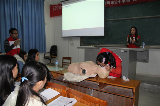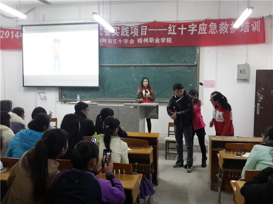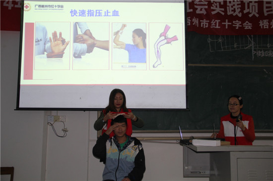 近日,学院学工处与梧州市红十字会在学院多媒体教室开展了多场红十字应急救护技能培训活动。学院学工处李少成处长主持活动仪式,梧州市红十字会专职副会长黄超亮亲自为同学们演示救护技巧。