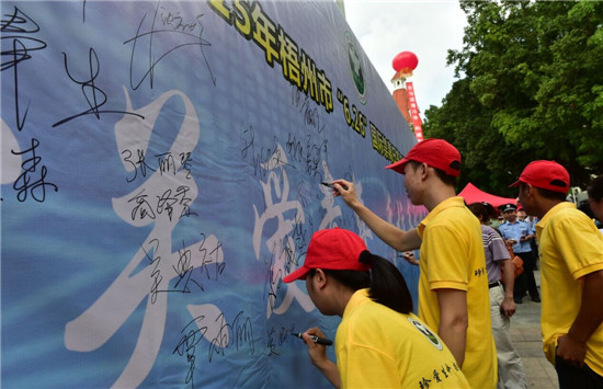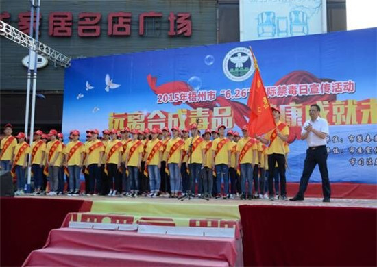 为进一步增强全民禁毒意识,最大限度地降低毒品对社会的危害,切实提高beat365师生识毒、防毒知识和抵制毒品危害的能力,6月26日下午,beat365300余名师生积极参与了在鸳江丽港广场举行了以“远离合成毒品,成就健康未来”为主题的梧州市“6.26” 国际禁毒日活动。