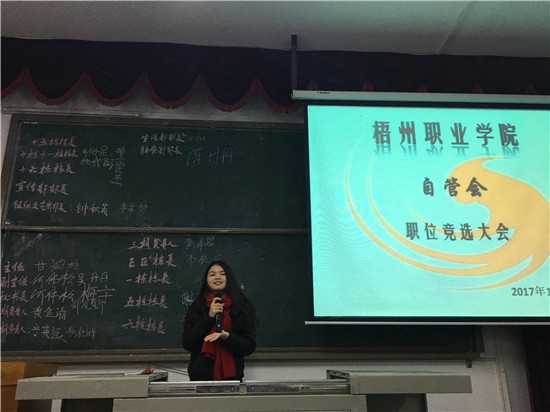 竞选大会上,竞选人依次上台进行演讲,表达了参加宿舍管理,服务学生的强烈愿望。竞选人慷慨激昂、幽默精练的演讲都给现场老师、同学留下深刻的印象。经过激烈的其中,甘鸿柱同学表现突出,成功当选为为第八届学生公寓自我管理委员会的主任。竞选大会共选出了19名学生干部,