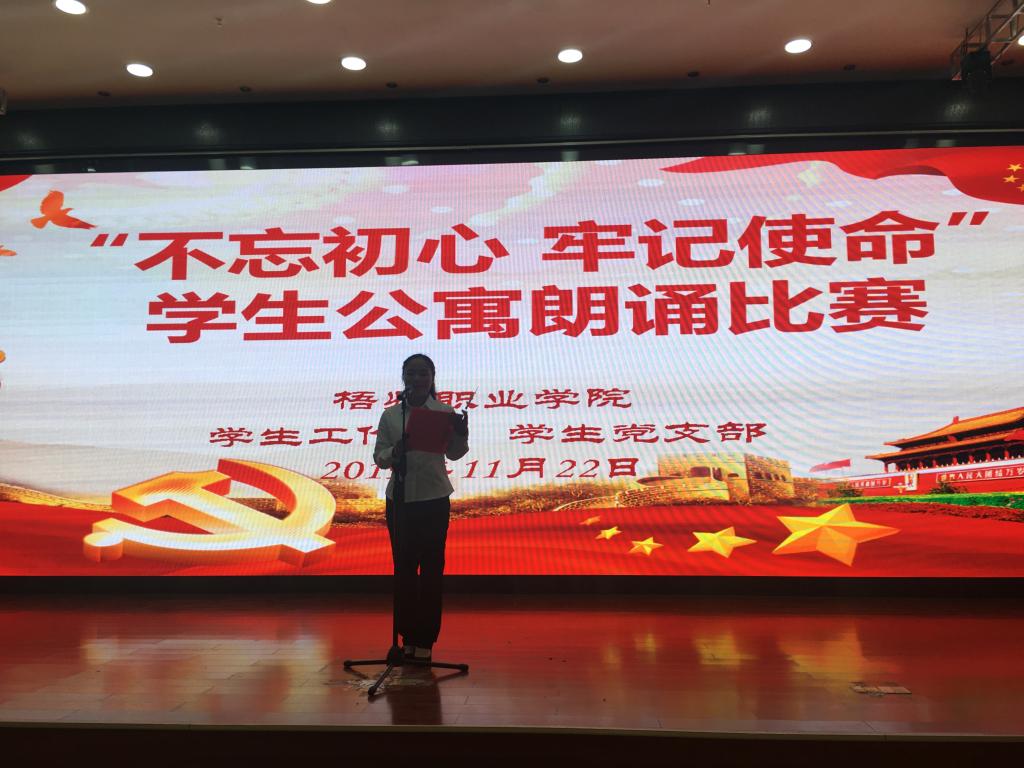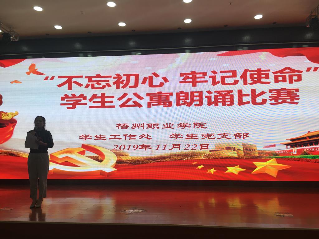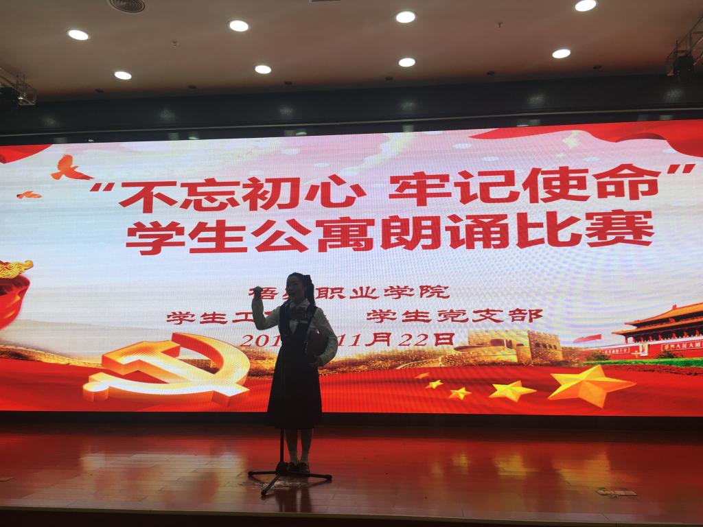 2019年11月22日下午14:30分由学生工作处、学生党支部在图书馆报告厅举办了。朗诵比赛中,来自6个系部的选手服装整齐、精神饱满,结合自己的专业学习,用一篇篇发自肺腑、感人至深的文章,抒发了对党、对祖国、对人民,对学习的无限热爱。其中,汽车工程系选手冯键军、黄宝萍、黄梣朗读的篇目是《坚定本心,不畏将来》,在背景音乐的配合下激情演绎、声情并茂,选手们用整齐划一的动作,多样的形式,不同的风格展现了学子的风采。卫生职教部选手徐莉朗读的篇目《用初心凝聚使命》说出了医护专业学生“白衣天使”的梦想和初心就是对人民赤胆忠心,以病人为中心的救死扶伤、无私奉献。教育系选手周畅的《初心》朗诵得激情澎湃,让人听了热血沸腾。从朗诵中,我们看到了同学们紧跟时代砥砺前行,担当责任奋发有为的精神风貌,赢得现场观众的热烈掌声。