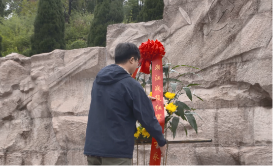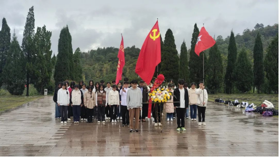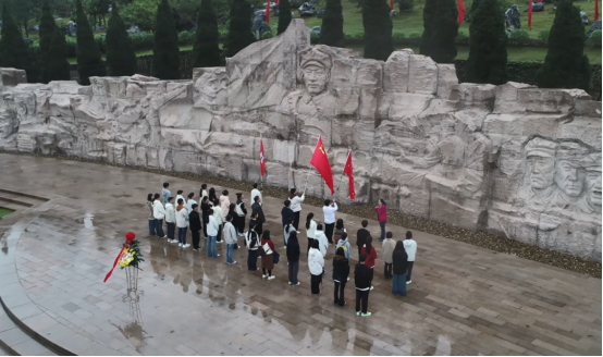 参观纪念馆结束之后,研学团冒雨步行前往红军长征湘江战役纪念园。来到纪念园内,映入眼帘的是红军英烈大型写意浮雕,在凭吊广场革命烈士雕塑前,全体同学整齐列队、肃然而立,怀着对革命先烈的无比敬仰,向红军英烈默哀,并敬献花篮、行鞠躬礼,表达对革命先辈的崇高敬意与深刻缅怀。
