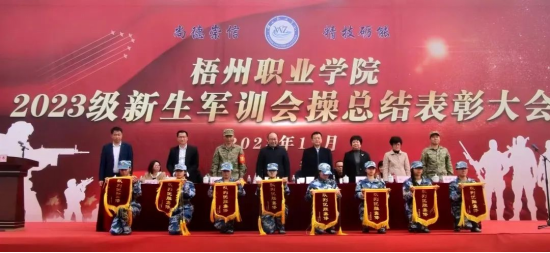 陈森英校长宣读2023年学生军事训练表彰名单。2023级学生军训优秀学员600名;2023级学生军训内务优胜集体62个;2023级学生军训优秀班集体16个:一营(1连,2连,9连,15连,19连,16连)、二营(47连44连,48连,49连。三营:57连,58连,62连)、四营(66连,68连,69连);2023级学生军训优胜队列16个:一营(3连,22连,5连,10连,11连,12连)、二营(46连,42连,45连,37连)、三营(50连,52连,60连)、四营(76连,77连,81连)。与会领导为获奖连队及个人代表颁奖。时伟书记代表学校向长洲区人民武装部赠送锦旗。