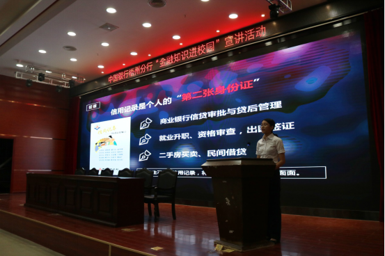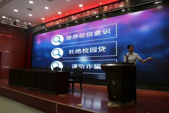 活动上,中国银行的工作人员运用PPT、视频播放等形式,通过通俗易懂的授课方式为同学们重点讲解了征信、校园贷、网络诈骗的危害,号召大家珍爱信用记录,防范违法违规金融活动侵害。
