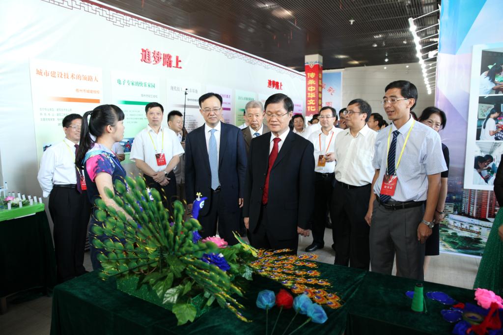 2015年11月8日,宝石娃娃才艺术展示期间,自治区政协副主席沈北海在梧州市市长朱学庆陪同下,参观考察学院(中心)展区