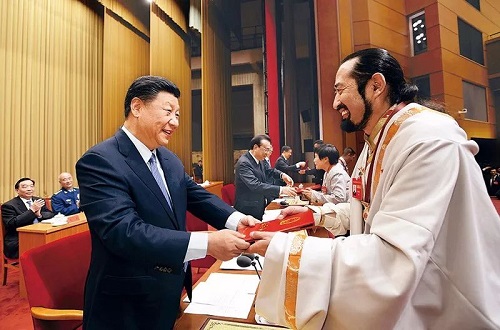 2019年9月27日,习近平总书记出席全国民族团结进步表彰大会并发表重要讲话。这是习近平等向受表彰的模范集体和模范个人代表颁奖。新华社记者 李学仁/摄