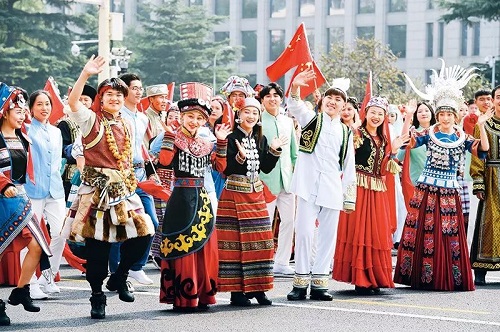 2019年10月1日上午,庆祝中华人民共和国成立70周年大会在北京天安门广场隆重举行。图为群众游行中的民族团结方阵。新华社记者 范培珅/摄