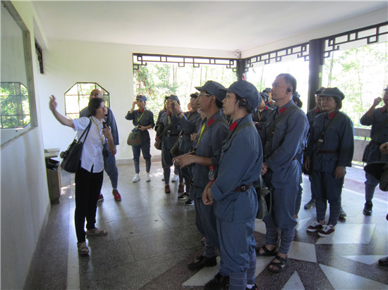 在黄洋界,学员们仔细聆听黄洋界保卫战的有关介绍,齐声朗诵毛泽东诗词,兴致勃勃地探寻当年的战斗遗迹。大家在山顶的战壕前沉思,在哨口阵地的迫击炮旁怀古,在挑粮小道上回忆《朱德的扁担》,亲身体验红军长途挑粮的艰辛。