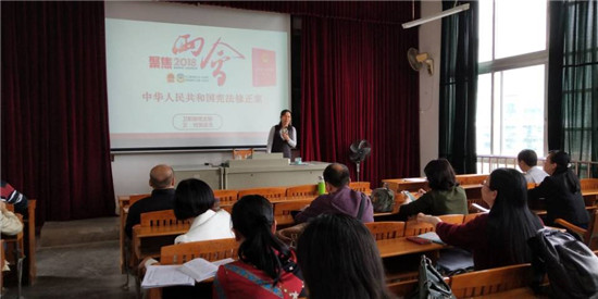 4月25日下午,卫职部在一期教学楼开展2018年《宪法修正案》党课学习。卫职部党支部书记林智东主讲党课,学院副院长皮至明、卫职部全体党员和教师参加了学习。 林智东从宪法是国家的根本法、宪法修改完善的意义、修改宪法的原则要求、宪法修正案(草案)内容解读、维护宪法权威捍卫宪法尊严等五大方面,用生动形象的语言,为全体与会人员进行了深入解读。她强调,我们要立足中国国情,深入理解和准确把握我国宪法发展的特点和规律以及此次宪法修改的总体要求和原则,始终坚持和拥护中国共产党的领导,步调一致向前进,才能实现中华民族伟大复兴的中国梦。 党课让党员教师们对宪法有了更多的了解,大家纷纷表示,将深入学习贯彻宪法,带头成为宪法的坚定拥护者、积极传播者和自觉践行者,并把学习内容融入到今后的教学工作中,让学生也从中获益。